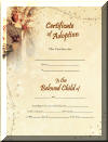 This8½ x 11 inch, Blank,Adoption Certificate has an Angel at the upper left corner with gold foil accents and gold stars scattered around the border on an pale golden background.