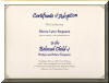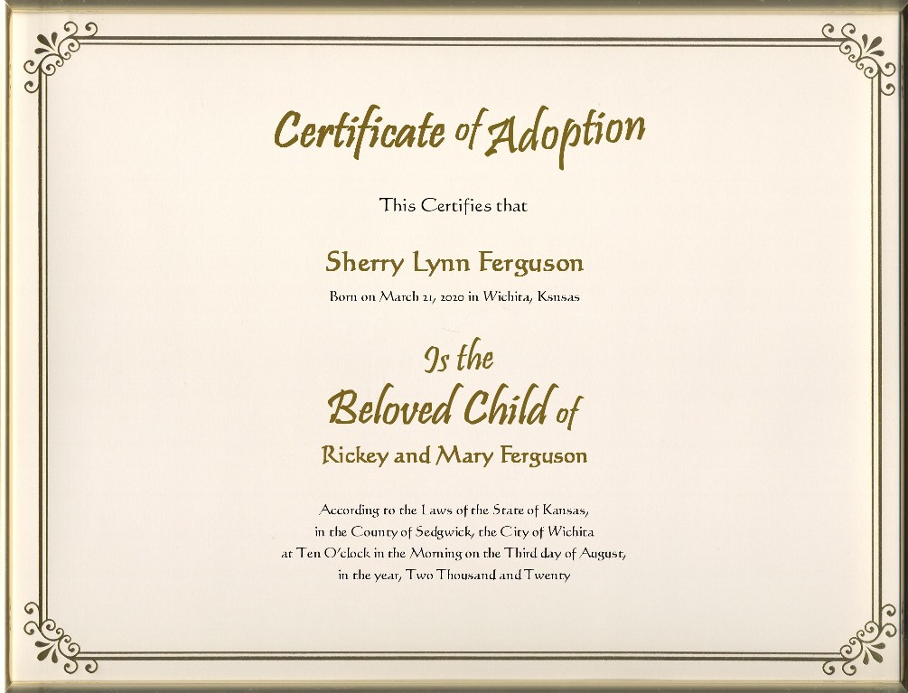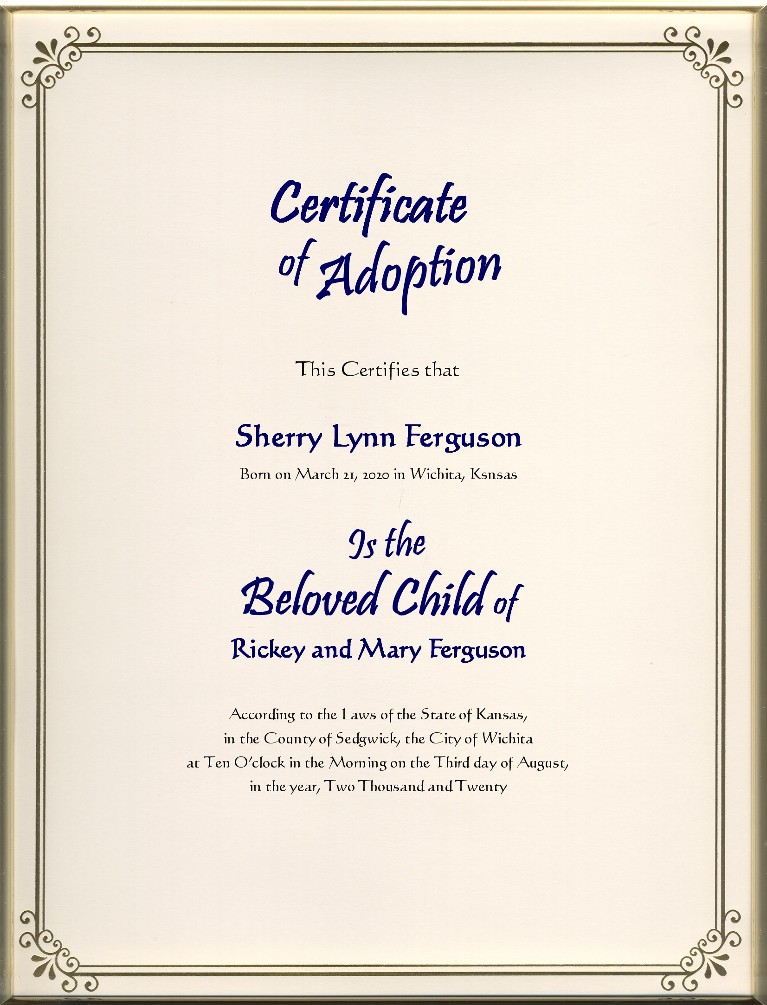 This 8½ x 11 inch, Custom Printed, Adoption Certificate has a simple Gold foil Border with scrolling at the corners on an Ivory background.