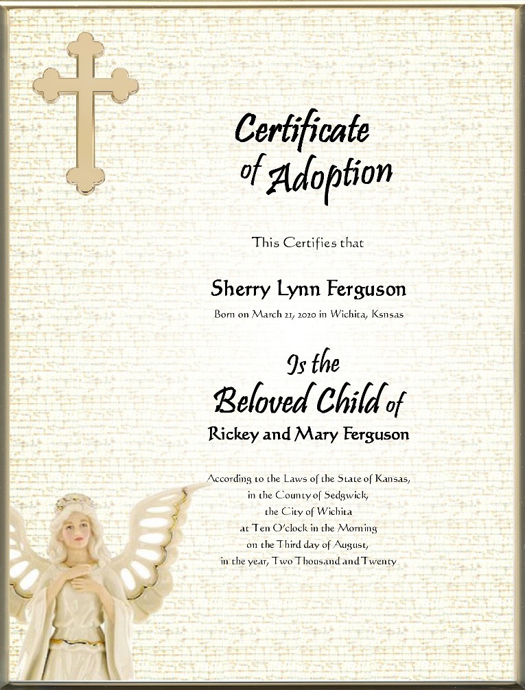 This 8½ x 11 inch, Custom Printed, Adoption Certificate has an Angel at the lower left corner with a gold cross at the upper left corner on a white and gold background.