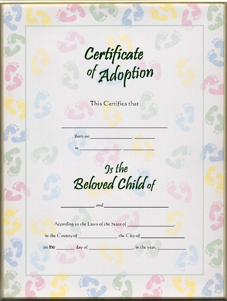 This 8½ x 11 inch, Blank, Adoption Certificate has a variety of multi-colored baby feet scatter across a white background with a white center.