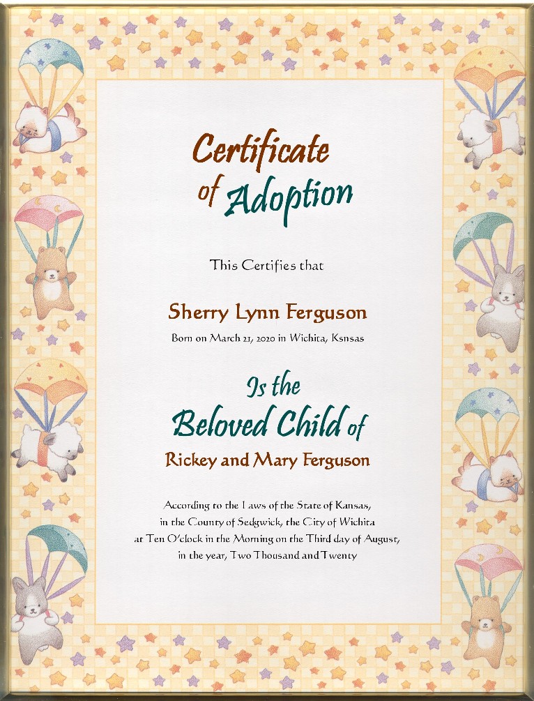 This 8½ x 11 inch, Custom Printed, Adoption Certificate has little critters parachuting around the border on a pale yellow background and a white center.