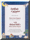 This 8½ x 11 inch, Custom Printed, Adoption Certificate has a gingham outer border, a dark blue starry night inner border with nursery rhyme characters scattered around and a white center background.