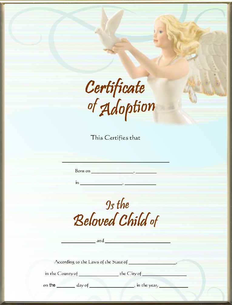 This8½ x 11 inch, Blank,Adoption Certificate has an Angel with a white Dove at the upper right corner on a blue, green, orange and aqua striped background.