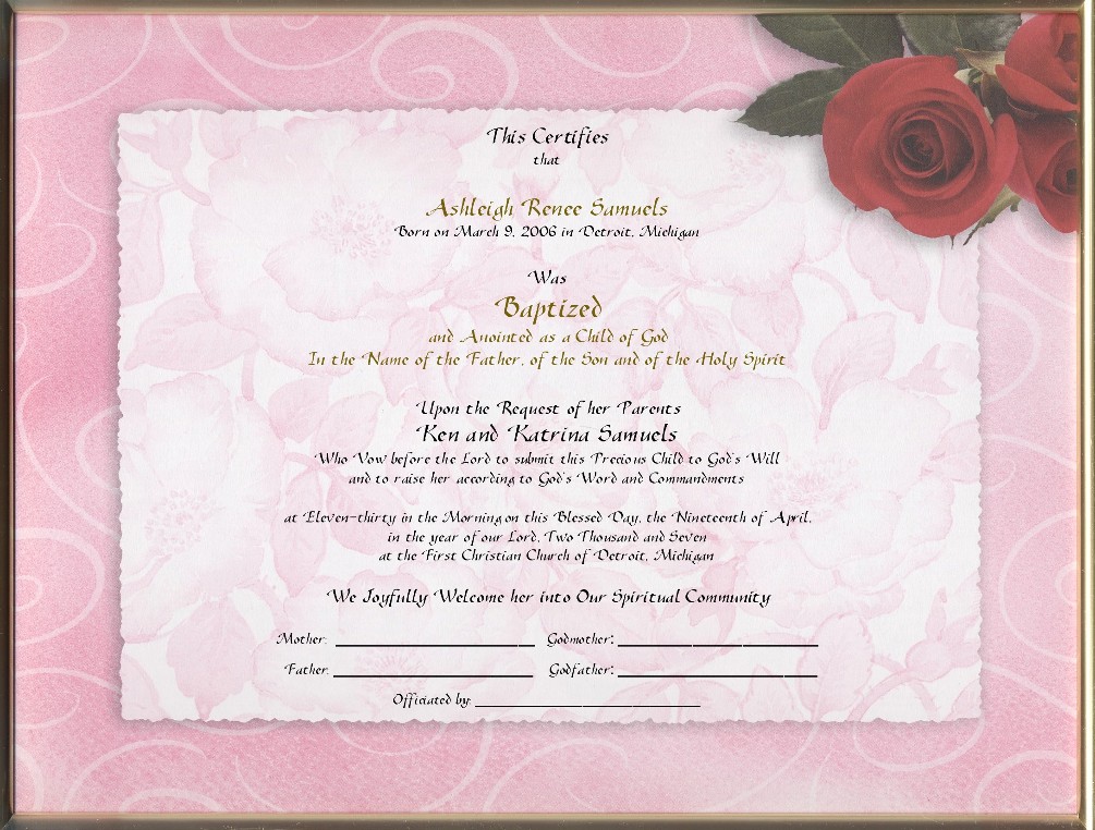 This Lovely, 8½ x 11 inch, Custom Printed, Baptism Certificate has a bright pink swirl border surrounding a light pink and white background with three red roses at the upper left corner.