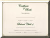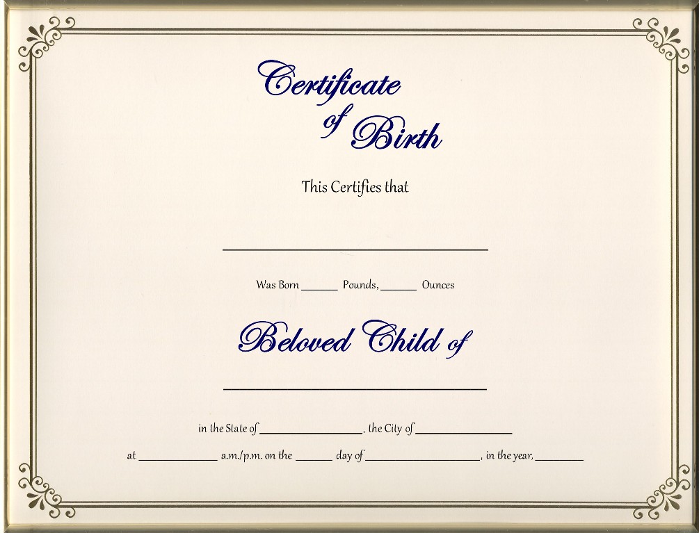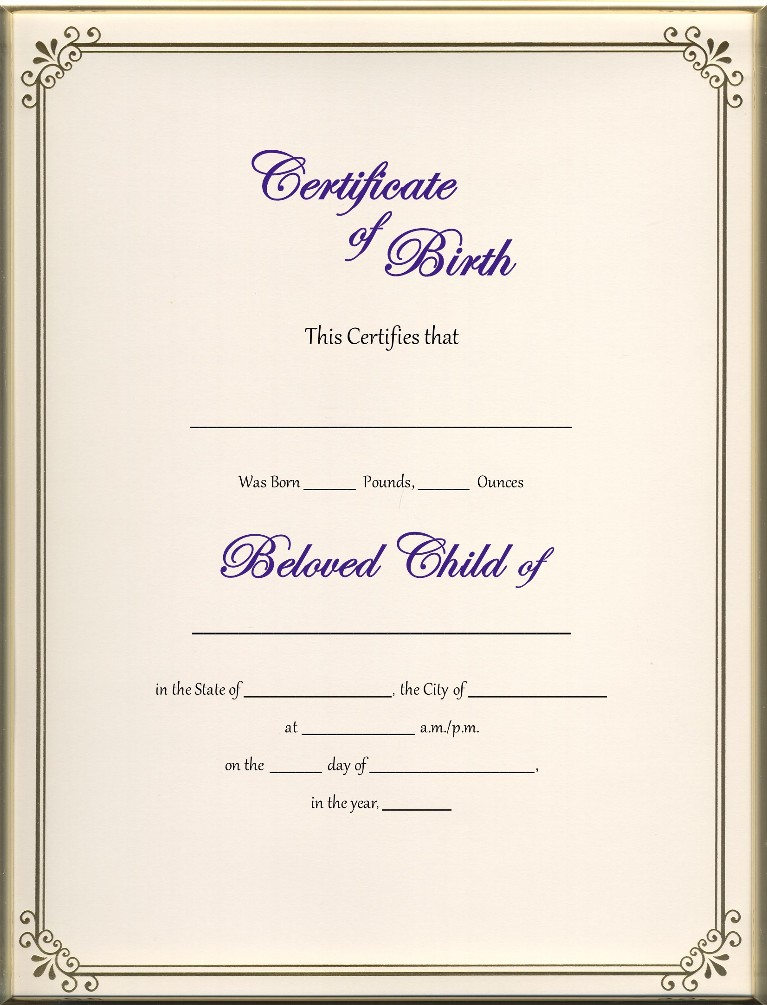 This 8½ x 11 inch, Blank, Birth Certificate has a simple Gold foil Border with scrolling at the corners on an Ivory background.