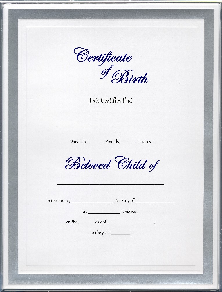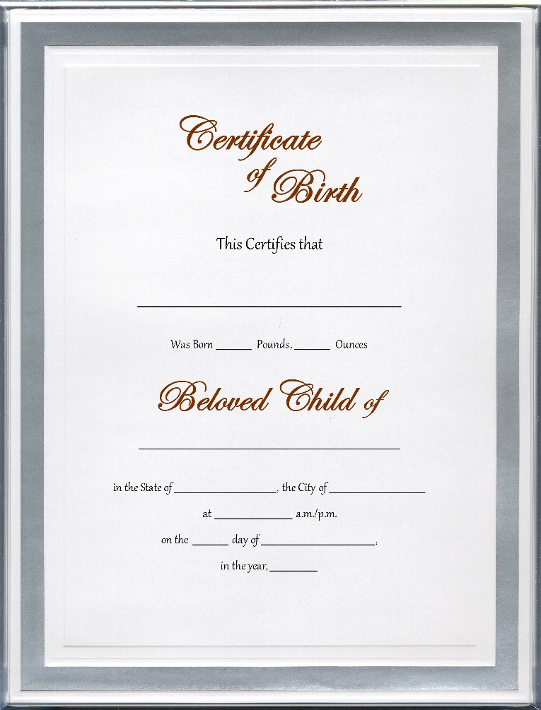 This8½ x 11 inch, Blank,Birth Certificatehas a thick silver metallic Border surrounding the Certificate withsilver inner frame on a pristine white background.