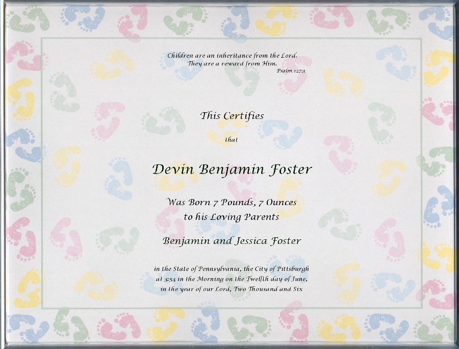 It's a Beautiful Certificate printed in Black with words from the Bible at the top,