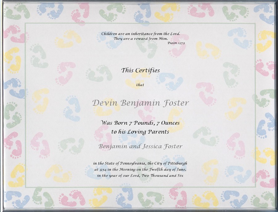 This Adorable, 8½ x 11 inch, Custom Printed, Birth Certificate has a variety of multi-colored baby feet scatter across a white background with a faded white background in the center.