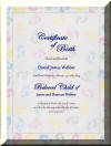This 8½ x 11 inch, Custom Printed, Birth Certificate has a variety of multi-colored baby feet scatter across a white background with a white center.