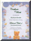 This 8½ x 11 inch, Custom Printed, Birth Certificate has a Teddy Bear at the bottom with Baby toys scattered around the blue sky background with a pale blue center.