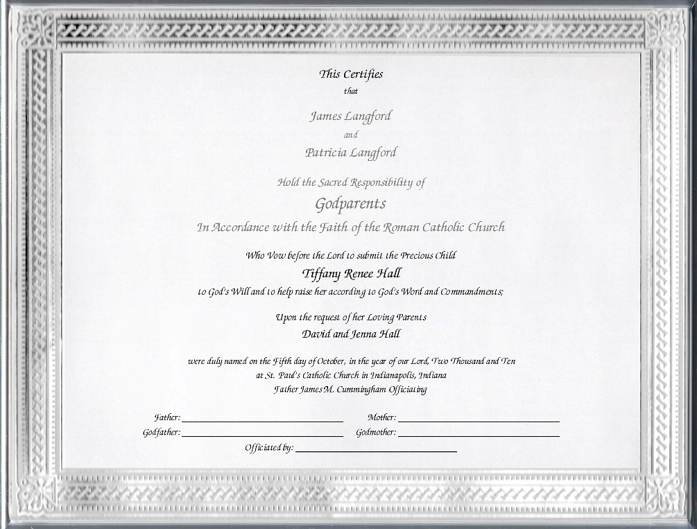 This Classic, 8½ x 11 inch, Custom Printed, Catholic Godparent Certificate has a wide metallic Silver Border surrounding the Certificate on a pristine white background.