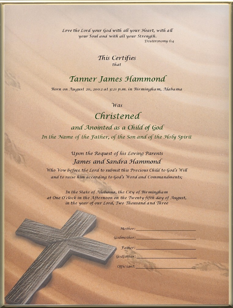 This Inspirational, 8½ x 11 inch, Custom Printed, Christening Certificate has portrays the inspirational poem, "Footprints in the Sand" and has an old wooden cross laying in waves of sand with footprints leading to and from the cross.